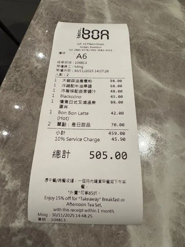 佐敦法式小餐館🫕 歌地雪花等級32025-12-02 關注 這家法式小餐館的大蝦蒜油扁意粉香氣撲鼻,橄欖油與蒜油完美融合,帶出油潤卻不膩的層次。大蝦肉質緊實彈牙,微焦帶甜,與意粉的蒜香鹹香相得益彰,令人食指大動。慢煮日式叉燒溫泉蛋井則細膩柔滑,叉燒油脂分布均勻,入口即化。溫泉蛋的蛋黃如金流出,滲入飯粒間,令整體口感更添濃郁。炸雞外層酥脆,肉汁飽滿,搭配牛油果醬出奇地清爽,綠色果香平衡了炸物的厚重。炸薯條金黃乾身,不油不軟,灑上碎芝士🧀後爽脆可口。Bon Bon博士茶牛奶咖啡濃郁順滑,茶香混著咖啡的焙烤氣息,苦中帶甜,是一道餐後完美的飲品。以上食評乃用戶個人意見 , 並不代表OpenRice之觀點。讚好分享佐敦法式小餐館🫕 Bistro Bon Bon https://s.openrice.com/QrbT04MvV00檢舉 張貼 評分4味道4環境4服務4衛生4抵食用餐日期2025-11-30用餐途徑堂食