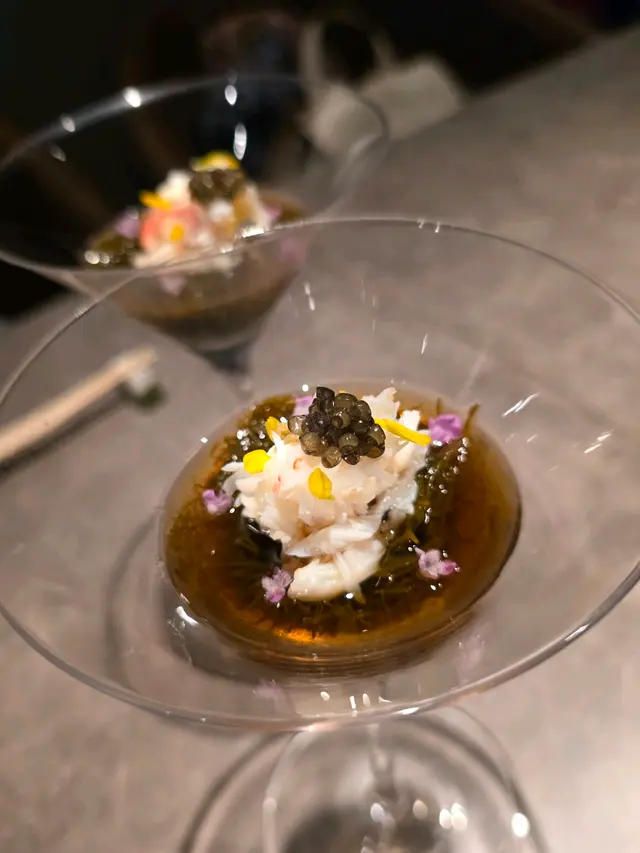 🍜 松葉蟹配水雲酢及法國黑魚籽:蟹肉鮮甜,搭配酸酸的水雲酢,口感滑嫩,黑魚籽更添層次感。
