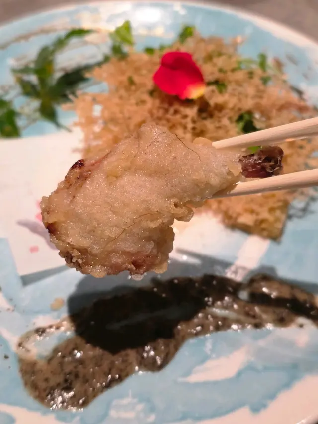 🍗 天婦羅法國鵪鶉髀配黑松露野菌汁:天婦羅炸得酥脆,炸漿輕薄鵪鶉肉嫩, 黑松露醬香氣四溢,搭配粟米鬚更是絕配。