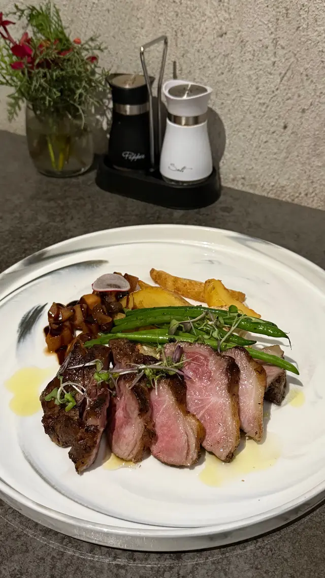 無論侍應同食評都推介,又真係比手指公👍🏻食落去有少少似叉燒,少少甜,肉質好稔好嫩,煎到好香,切開嗰下咇晒啲油出嚟,由蘋果醬啱啱好中和返個油膩感😌