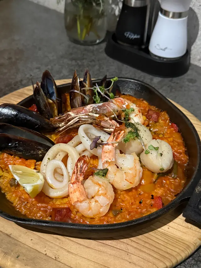 食西班牙菜點可以唔嗌Seafood Paella!以熱辣辣平底鑊上桌,一上枱勁香🔥面層海鮮有藍青口、蝦、帶子、魷魚等,陣容鼎盛,全部都好新鮮,想唔好食都難😌加咗海鮮濃湯燜煮嘅意大利飯咬落面頭有啲脆,中間有啲煙韌。𝟮個人𝘀𝗵𝗮𝗿𝗲啱晒🤰🏻