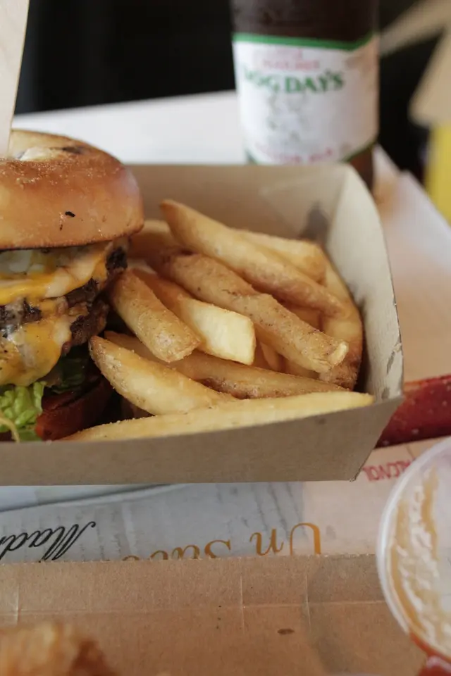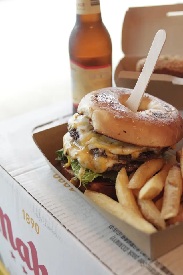份量十足的漢堡扒與bagel 和芝士完美融合
