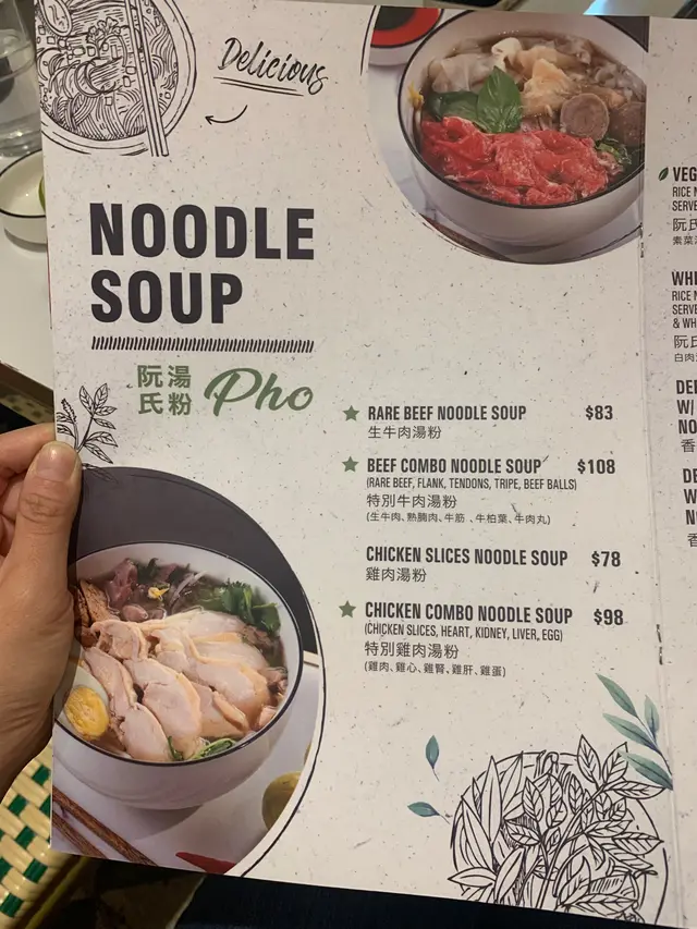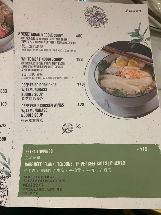 餐牌上都有好多越南食物的選擇,佢另外都有dinner set,但係我地當日散叫食物。叫咗 越式香茅雞翼($58) ,越式春卷-豬、蝦($68),香茅豬扒沙律檬粉($68),特別牛肉湯粉($108)。