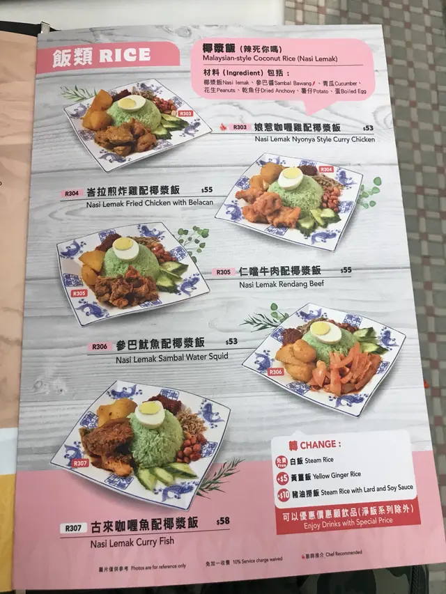 我地揀左仁噹牛肉配椰漿飯,南洋咖哩麵,馬拉沙爹串燒,咖央多士,加一凍一熱既美祿