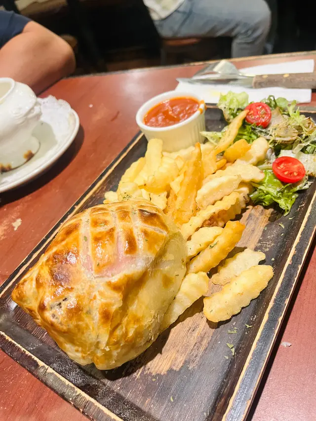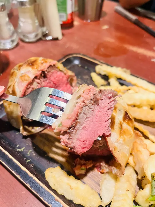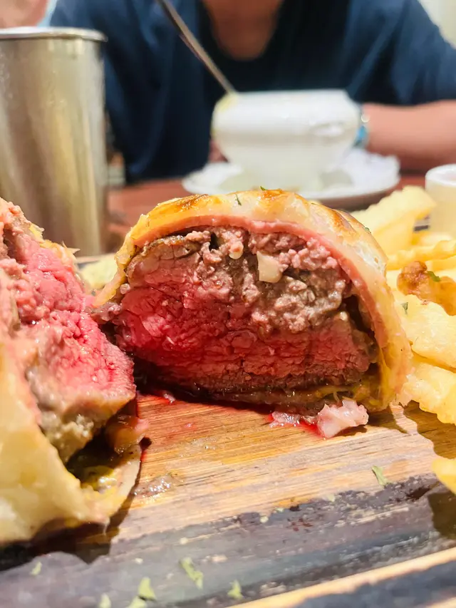 叫咗五成熟,火候控制得好好。外層酥皮金黃香脆,肉質極鬆軟好易切開,入面重係粉嫩嘅色澤😌肉同酥皮之間係充滿油香嘅肉肝醬,口感層次豐富😌