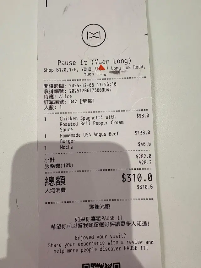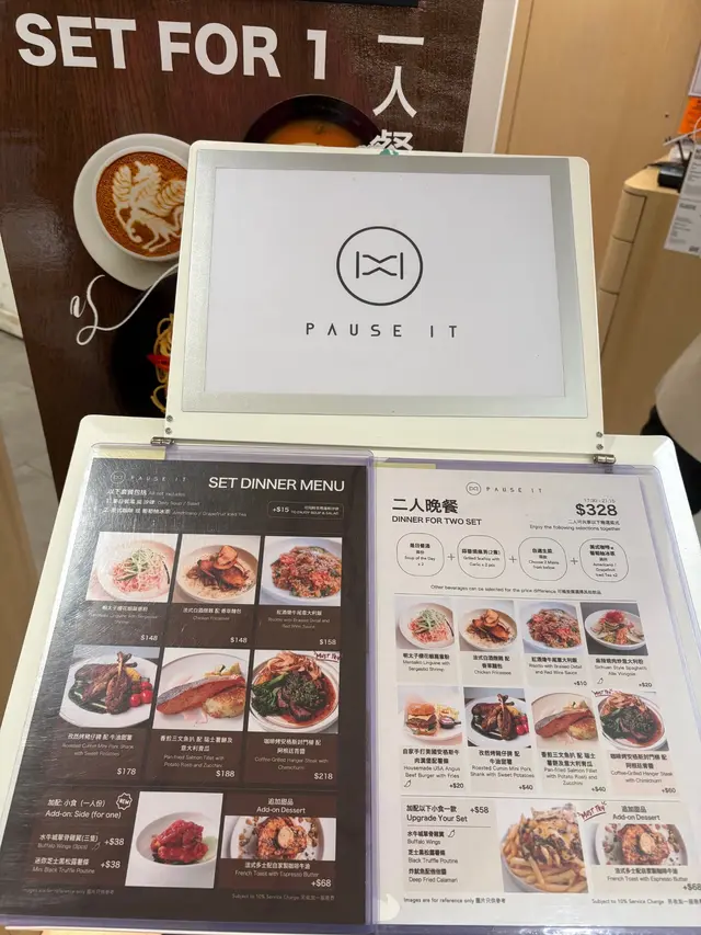與舊同事在元朗相聚,同事提議到元點L1樓一間coffee shop<PAUSE IT>享用晚餐,這間coffee shop環境簡約又舒適。咖啡店名<PAUSE IT> 挺有意思,與LOGO平放著的流沙計時器很配,提醒我們停下來,休息一下。的確在繁忙的生活中,我們都需要放慢腳步,休息一回兒。看看餐牌,我們點了烤甜椒忌廉汁雞肉意粉、自家手打美國安格斯牛肉漢堡配薯條和朱古力鮮奶咖啡。