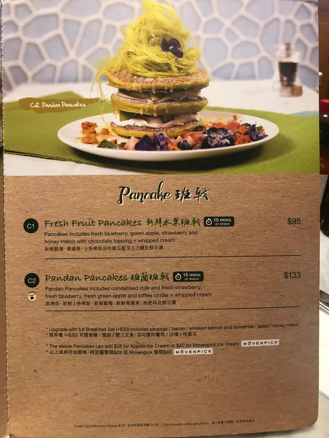 最後就係呢個班蘭班戟喇。見到menu裡面張相好吸引! 我最鍾意襯 theme 㗎喇,所以見到最頂層配左個綠色糖絲,即刻開心左。班蘭班戟有三層,最頂層係有班蘭味嘅糖絲,跟住個兩層係 cream 同青蘋果。班戟質感厚實,班蘭味同青蘋果都幾夾,再加埋旁邊的蜂蜜脆脆,口感都幾豐富。