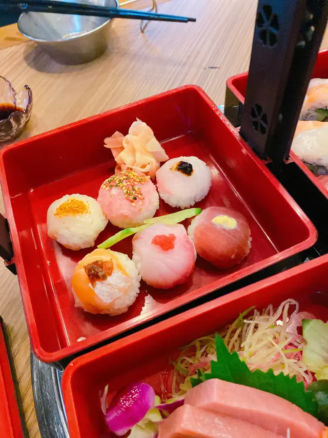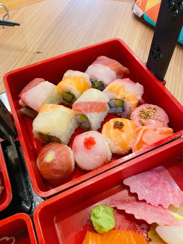 為海鮮愛好者帶來驚喜。有各款時令海鮮刺身和彩虹卷。拼盤有三文魚,吞拿魚和大蝦,新鮮肥美,入口溶化。飯團米飯緊實,帶點咸香。