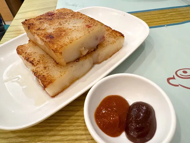 廿零蚊食到三大件煎得香脆嘅蘿蔔糕,真係好抵喎!佢唔似一般食到嘅蘿蔔糕咁成口粉,而係真係食到有好多大大粒嘅蘿蔔,同時亦有少量臘腸點綴,點辣椒醬、甜醬或就咁食都好滋味。
