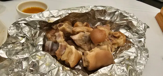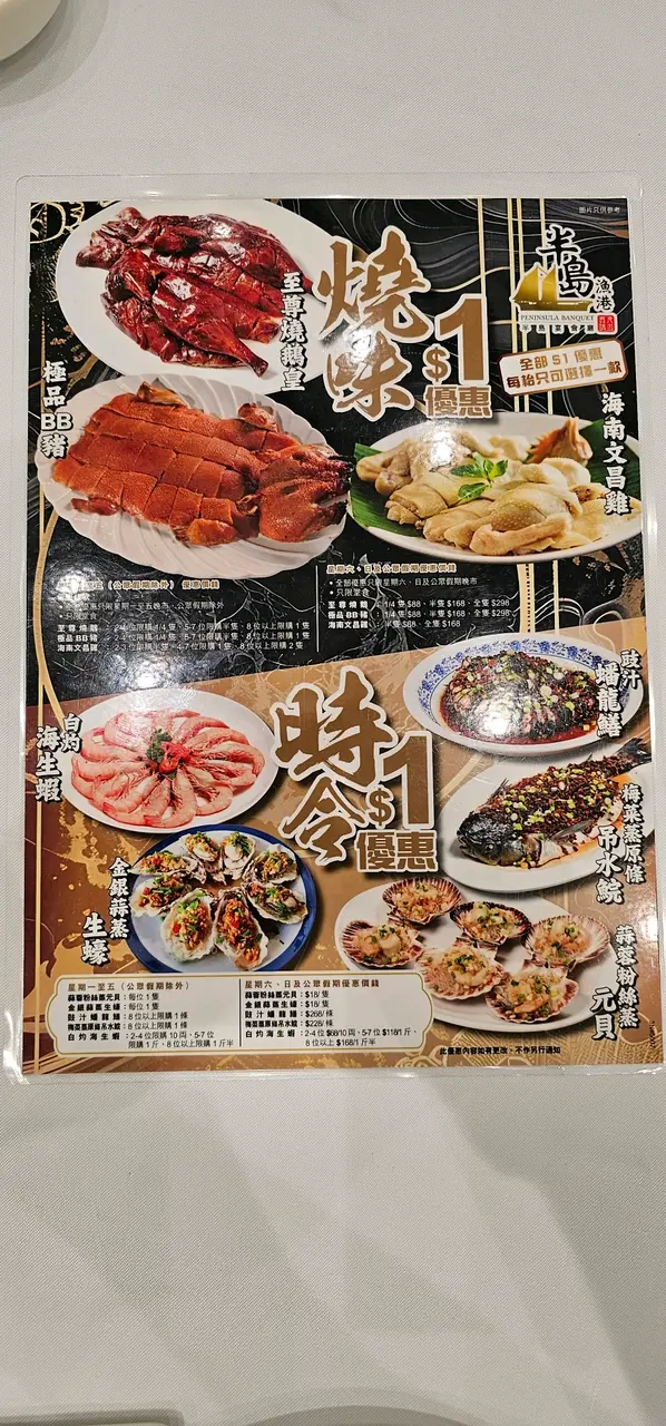 尋日同老婆喺Yoho睇完戲諗住跟手食晚飯,喺商場入面揀嚟揀去都揀唔啱,心目中就想食海鮮小菜既,最後揀咗係Yoho附近嘅半島宴會廳,商場行去大約5-6分鐘倒都非常便利,去到大約06:00上面仲有好多位,裝修好靚有貴格👍🏻,座位寬闊坐得舒服, 坐低隨即點菜,揀咗【是日孖寶】西澳龍蝦伊麵底配清蒸沙巴龍躉仔($338),沙薑豬手($68)、鹵水豬腳仔($68),最後仲用埋個晚市優惠($1)揀咗極品BB豬(1/4隻),除咗蒸沙巴龍躉仔之外其他菜式都好快送上,先嚟1蚊BB豬份量都夠兩個人食,夠哂皮脆肉嫰好食又抵食,鹵水豬腳仔煮得好入味相信炆咗好耐咬落去做到骨肉分離,至於沙薑豬手就剛剛相反,做到皮同肉都好爽彈再配合埋個沙薑汁 真係好夾,龍蝦伊麵食得出個肉質新鮮唔係雪藏貨, 配埋上湯焗嘅煮法都好好食,最後出場嘅沙巴龍躉仔 雖然唔係好大條,但兩個人 都好夠食蒸得啱啱好唔會老配合個豉油汁非常滋味, 呢度整體食物水準都好高,現場