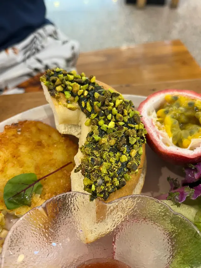 12種蔬菜開心果醬配果全日早餐 :琳羅滿目。其中的牛油果好creamy, 開心果貝果好煙靱而又奇妙地有好香口的開心果醬,越食越想食。