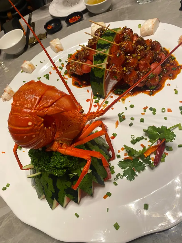 這道菜一上碟,我就只看到一串串的西瓜和龍蝦殼,首嚐口水汁西瓜,想不到竟然意外的好吃,味道甜甜辣辣又多汁,冰涼的西瓜也中和了口水汁的辣到。