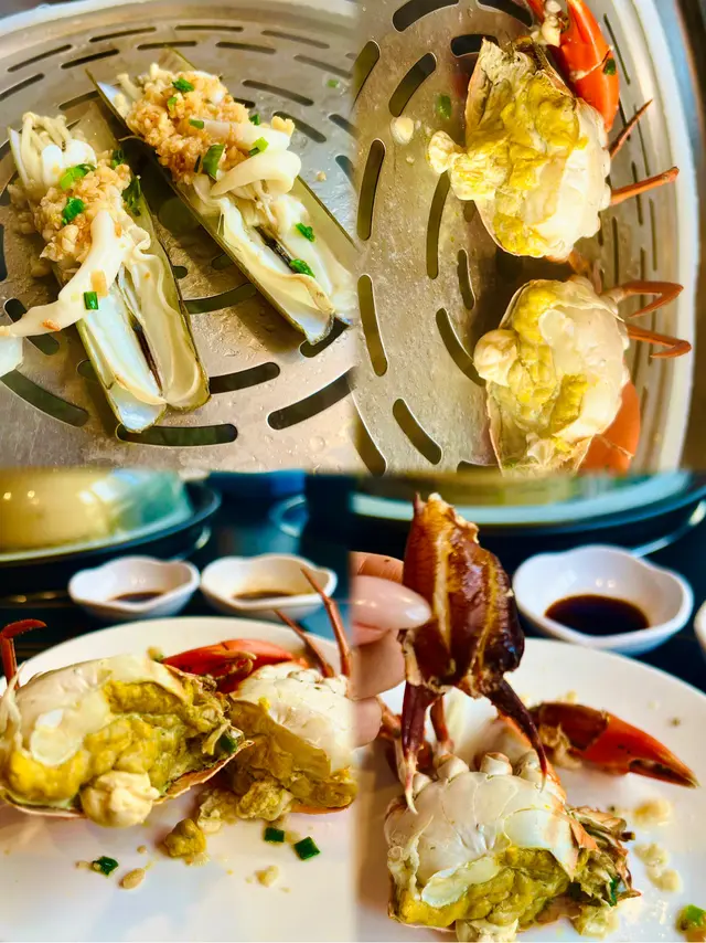 我們選了生猛肉蟹|日本元貝|深海龍躉|活大蟶子✨海鮮全部都好大隻勁新鮮!!每款海鮮蒸煮的時間都不同,服務員會幫手蒸,肉蟹肥美且爆膏超正👍🏻元貝厚到要切兩層,粉絲墊底蒸出來原汁原味的甜👻👻