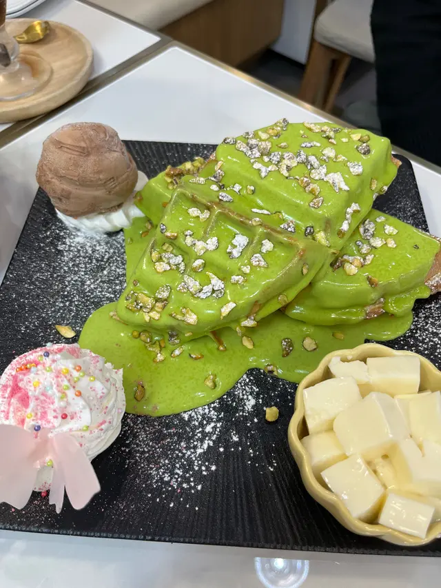 厚厚鬆軟窩夫淋滿幼滑香濃開心果奶蓋仲有開心果碎碎,口感豐富. 伴碟有個大朱古力雪糕球,冷熱交替刺激味蕾. 旁邊仲有豆腐粒、奶油. 同類型甜品真係未試過咁豐盛大份. 另外跟配咗個果瀼蜜桃烏龍茶清香解膩.