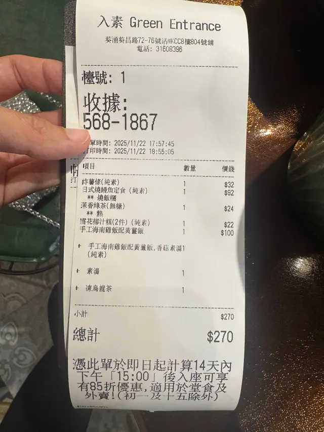 整體用餐體驗非常愉快,不僅有種類多樣的素食選擇,味道也十分出色,小朋友也適合食,也值得推薦給素食愛好者!14天內憑收據再來,還有85折,下次一定會再來。