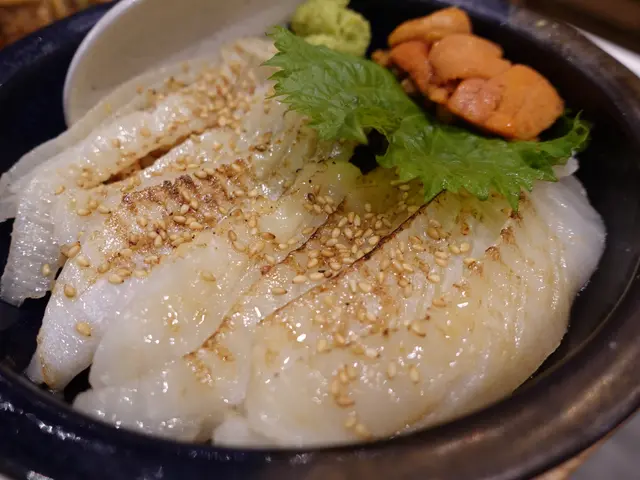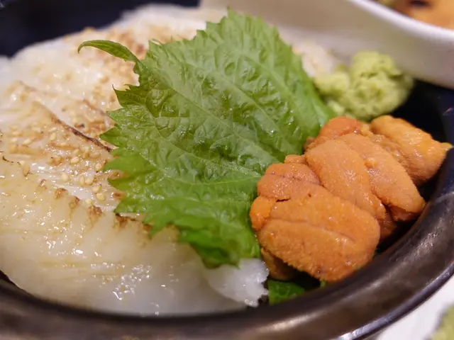 左口魚邊蓋滿米飯,上面還有紫蘇葉盛載著不少海膽。