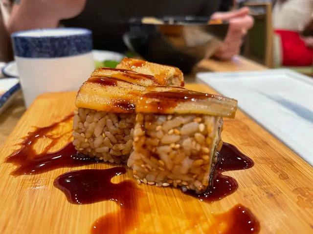 卷物上淋上濃郁的鰻魚汁。裡面包裹著紫菜,赤醋飯,蛋和青瓜,還加了芝麻粒,更香口。青瓜能中和鰻魚汁的濃膩感,實在不錯!