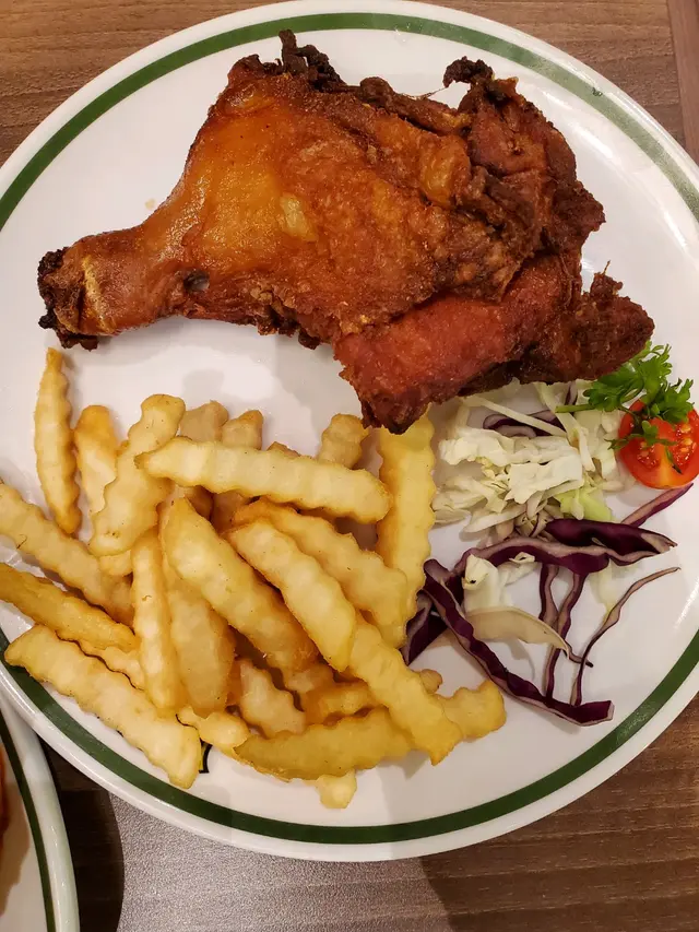 炸脾薯條又點少得,雞脾生炸既,非常香脆,仲好大隻下,肉質亦唔會韌。另外點左碟菜balance下費事淨係得油炸食物,碟菜都好大碟。