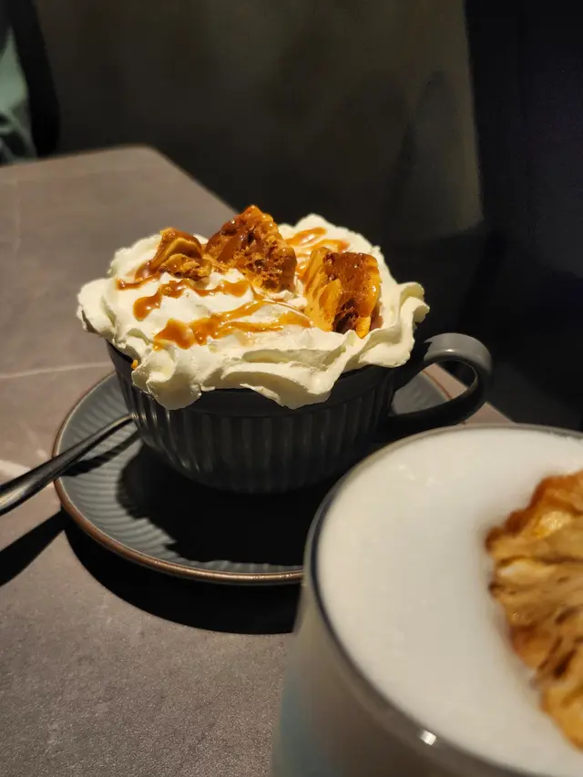 青提牛奶真係睇到好似雪山咁,底下有蘆薈粒粒。焦糖鮮奶咖啡加咗勁多焦糖蜂巢脆餅,好澎湃。