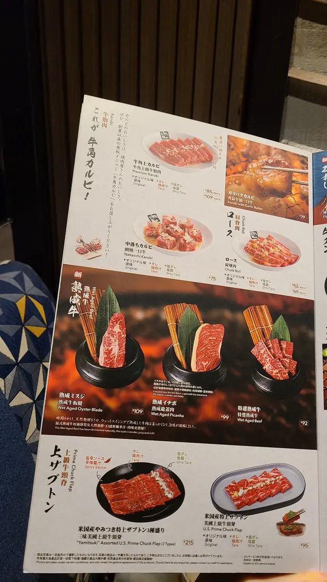 餐牌:主餐牌有前菜,沙律,燒野菜,水果,素肉,牛肋肉,熟成牛,牛頸脊,牛板腱,牛舌,內臟,燒肉盛合,和牛,豚肉,雞肉,海鮮,麵飯,湯,甜品。落單用手機落單。