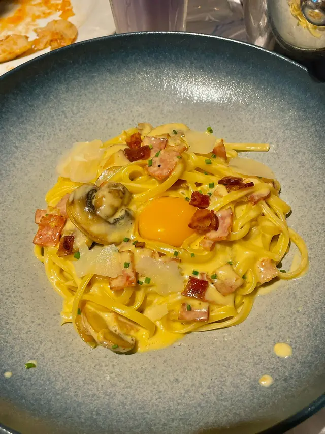 Carbonara Linguine(單點$118),表面鋪有煙肉脆、芝士、洋蔥、青蔥、大蒜,扁意粉口感軟硬適中,容易掛汁,芝士奶油醬口感濃稠,味道濃郁,配以蛋黃食用,蛋香味濃,蘑菇食落好Juicy。
