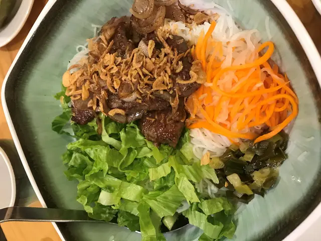 越式燒牛柳撈檬, 這可是整頓晚餐的高潮. 燒牛柳香味撲鼻, 令筆者流口水呢!很久也沒有遇過這種情況! 試一口, 燒牛柳非常淋滑, 加上丁點燒酒的香氣, 還用上蒜香片, 果真美味, 很推介呢!