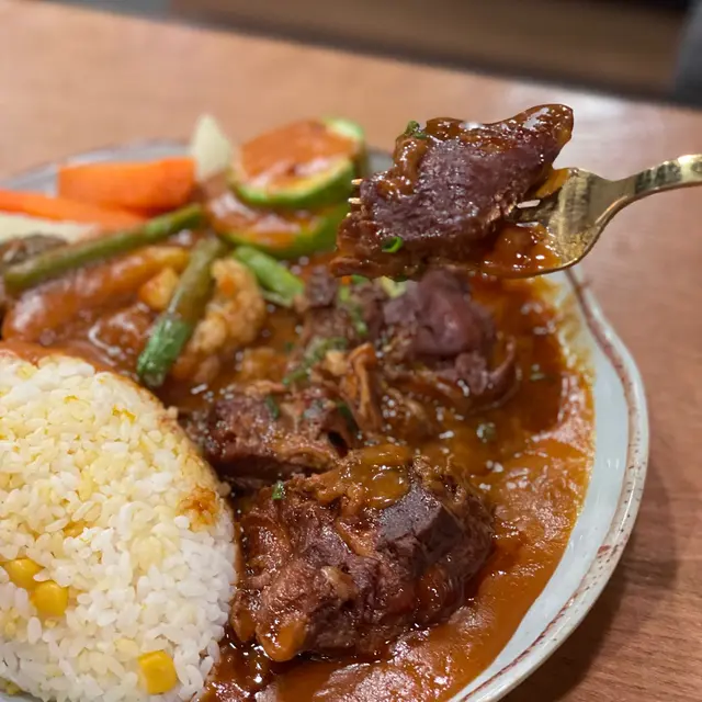 日式咖喱質感濃厚, 帶少少辛辣, 咖喱味香濃, , 仲有好多野菜, 豬軟骨炆到好淋身, 中間嘅軟骨入口即化, 撈埋南瓜粟米飯, 飯粒飽滿增加口感