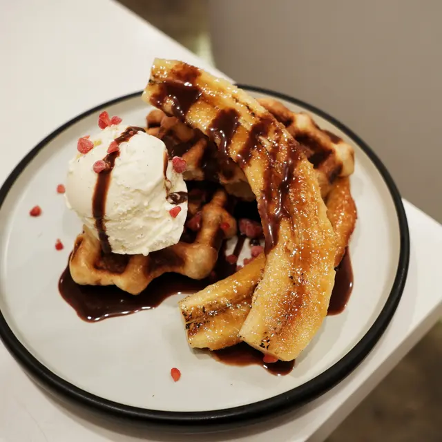 最近好興嘅牛角包窩夫,配埋焦糖香蕉、雲呢拿雪糕、朱古力醬🍫賣相吸引得黎✨牛角包窩夫嘅口感超級香脆,仲有牛油香🥰絕對係去食過咁多間數一數二嘅牛角包窩夫👍🏻❤️香蕉面層有層焦糖都好脆✨推薦