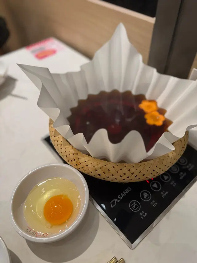 我們湯底選了關東壽喜燒和泰式酸辣蝦鍋🍲壽喜燒還是吃牛肉必點🥚甜美的醬汁和濃厚的蛋液非常搭配牛肉┭┮﹏┭┮,美妙美妙!泰式酸辣蝦鍋有點像是冬陰功的感覺🦐酸辣的湯底有豐富的香茅和檸檬草的香氣🍋酸酸的非常開胃,搭配清新的蘸料非常解膩!其他的火鍋配料就可以説是應有盡有!我最愛的還是牛肉和鰻魚😌吃完還能來個雪糕,完美完美!