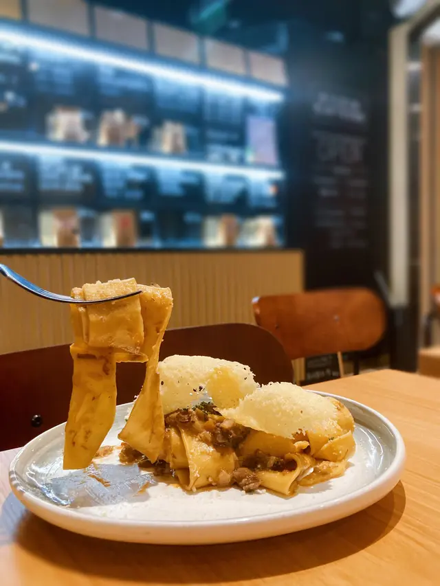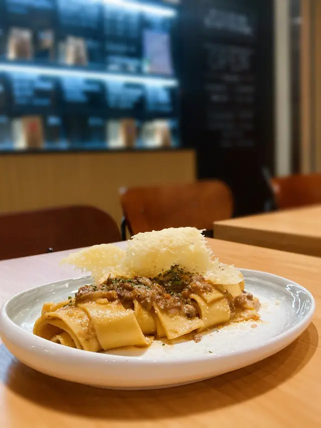 擺盤精美,麵條已經捲好,方便食用。寬條麵很有口感,煙煙韌韌,配搭鹹香的牛肋骨肉醬和芝士薄脆增添層次感。
