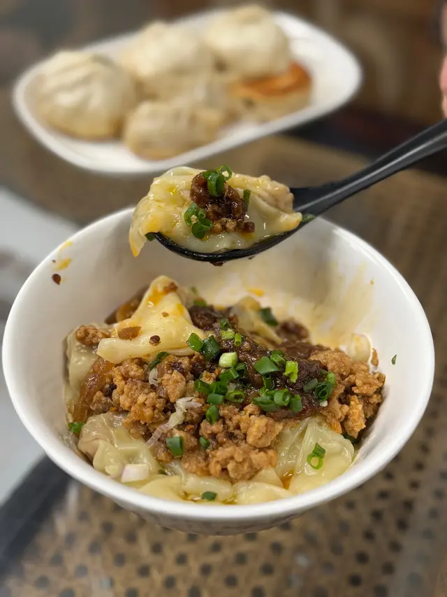 另一個叫咗雲吞麵,轉超必食香辣湯底,3個生煎包,及加錢叫豆漿。必食香辣湯底都係要加錢叫,驚太辣叫咗少辣。 湯底有啲似椒麻味,相對更開胃,同樣有雲吞、肉碎、蔥花,雲吞size啱啱好,湯底仲突顯咗雲吞嘅鮮味。生煎包外脆內軟,餡料調味適宜,唔會太鹹。