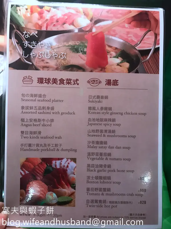 湯底的選擇有九款之多,分別有日式壽喜鍋、韓國人參雞鍋、血池地獄麻辣鍋、山地野菌清湯鍋、沙茶擔擔鍋、溫野菜蕃茄鍋、黑蒜油豬骨鍋,以及有額外收費的波士頓龍蝦鍋和蕃茄野菌蟹鍋。