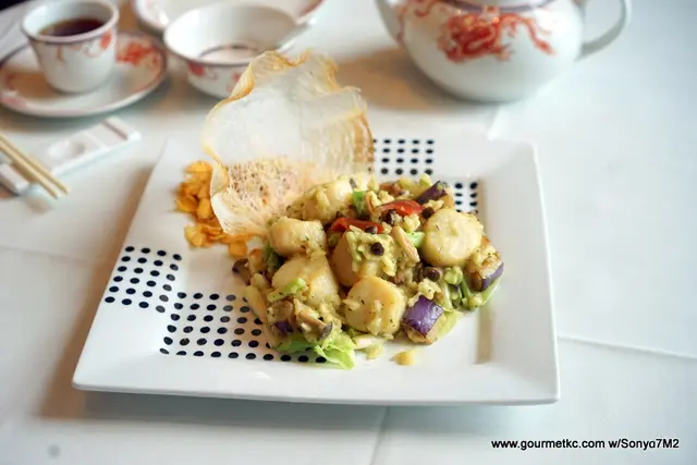 再來的香草脆米芥末元貝是一味有趣的菜式,先吃當中的帶子,跟西餐煎得表面呈焦糖化的做法不同,這裡的是原粒汆水再加入芥末醬汁煮成。此舉令味道更能均勻的遍佈其表面,而芥末醬的微微辛辣味道也襯托出帶子的鮮甜。加上粒粒脆口的脆米,當做海鮮主菜以外,其實視之為單尾選擇也行。只賣$168,值得一試。