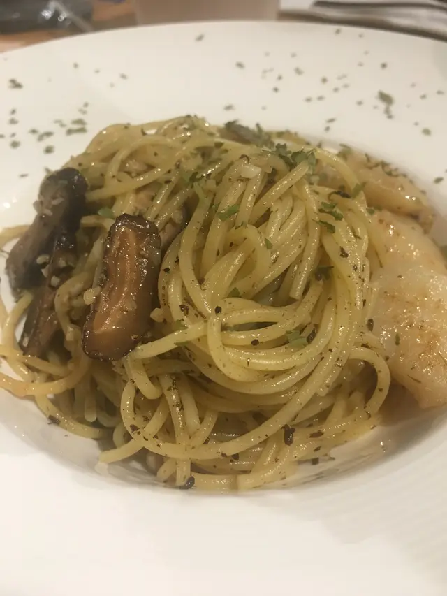 剛放上枱就已經聞到濃濃的松露香味,讓人瞬間開胃。這款意粉雖然沒有其他的多汁,但質感並不會很乾,放入口的瞬間,松露和香草的香味傳遍整個口腔,不鹹不淡的味道也不會令人覺得口渴。至於配菜方面就有珍菌和帶子,值得一提是那幾粒金黃的帶子,吃上去不會油膩之餘,還十分鮮甜香口,所以這款意粉在配搭帶子、茹菌和香草之下,簡直是色香味俱全。
