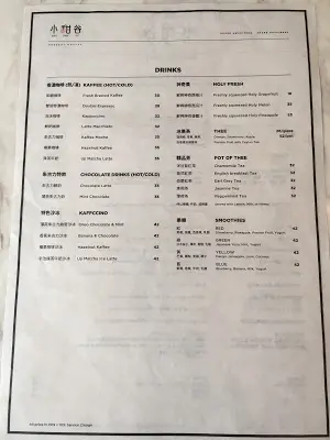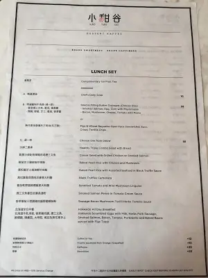 餐牌是簡單的兩頁紙,主要提供意式風味的佳餚及咖啡特飲。比較奇怪的是整個餐牌勻沒有甜品出現,及後忍不住向店員查詢,才得知要下午茶時段才開始有部分甜品供應,要再多些選擇,更要在黃昏六時之後。店員亦告知每間小甜谷所供應的甜品也略有不同,其中的銅鑼灣分店以日系抹茶甜品作主打。