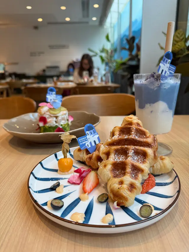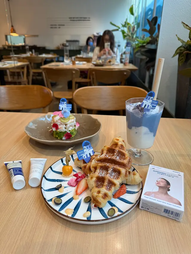 另外值得提提大家打返張卡,玻璃投影希臘的風景,加埋陽光透入,影相打卡都超靚,而且餐廳座位多,下午茶坐低嘆個tea 同朋友傾吓偈chill 一chill就最適合! 仲有部份位置陳列了Korres 的最新護膚產品給大家試用,大家有興趣都可以試試~
