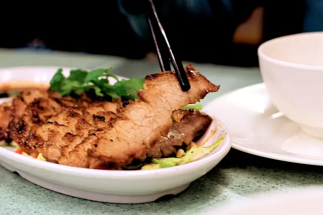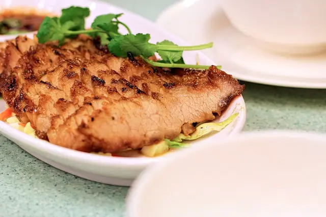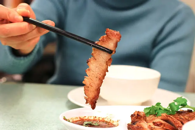 燒豬頸肉一客份量很足,每塊切很厚度均一,外邊帶炭烤過的焦邊啡色,入邊則是令人心動的豬肉紋理。