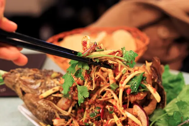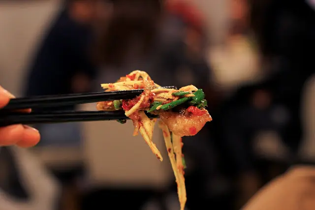 沙津中包含青木瓜絲及大量料頭,老闆教我們要木瓜絲加魚肉一齊食,食味會變得更 豐富。