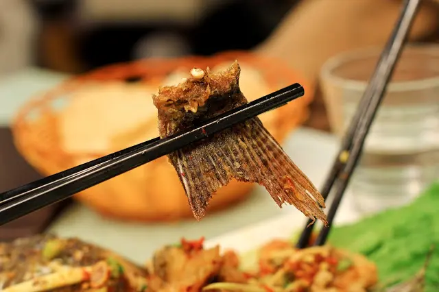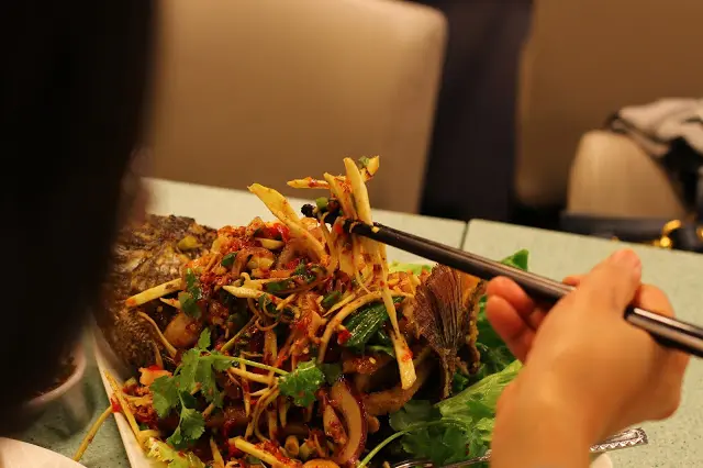 原條的鰂魚奉桌,魚肉起了拿去炸,餘下的魚身連骨炸後則用來做裝飾。