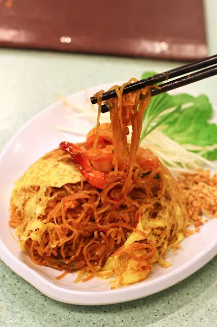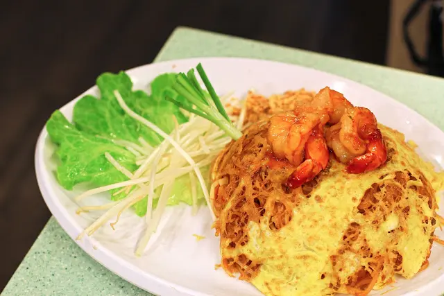 蛋煎成金黃網紋形狀,上邊放上三隻蝦。 金邊粉炒得很有穫氣,不會過乾,又不會太油。