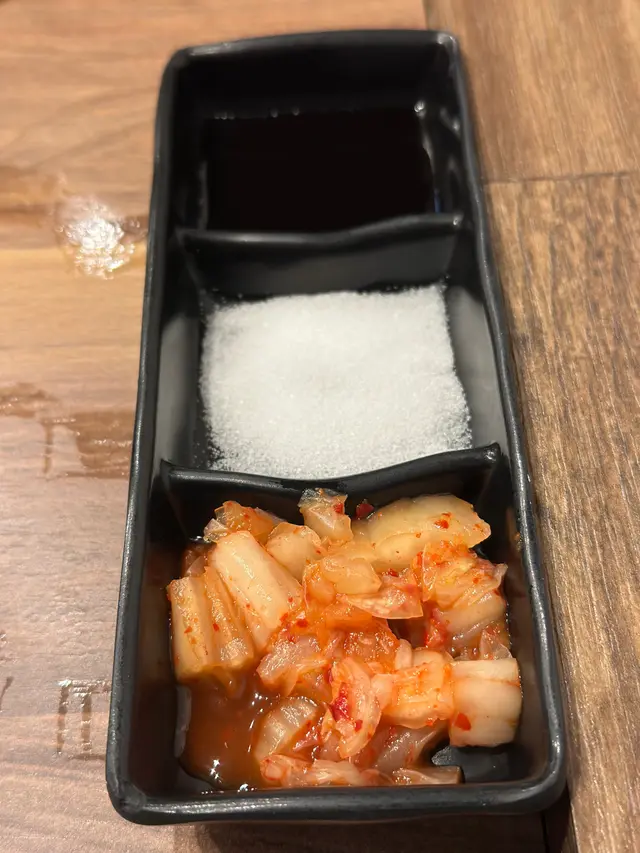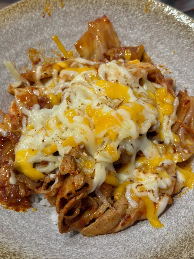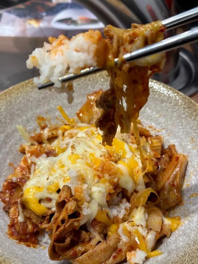 這個送多個飯嘅豬肉,味道非常正,微辣嘅泡菜伴薄片嘅豬肉和芝士,就咁吃已經非常好味,再加埋和牛漢堡,簡直是人間美食