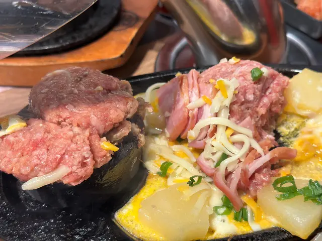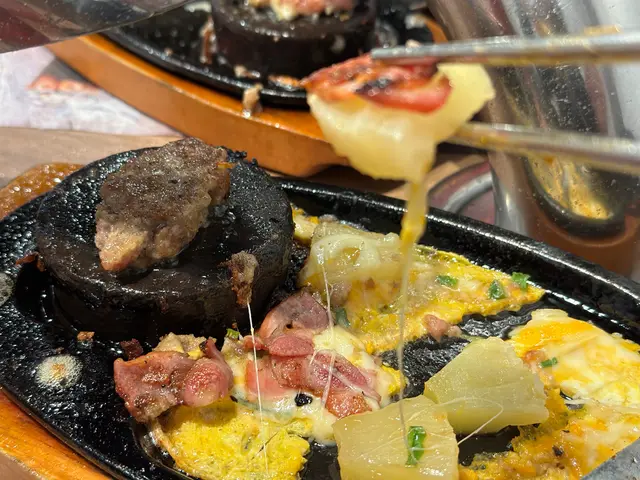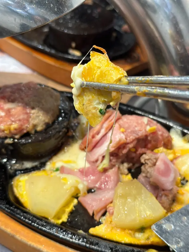 鐵板上有蛋漿,菠蘿和煙肉,仲有份量十足的和牛漢堡牛肉,自己把適當份量牛肉放在會熱石上,煎到兩邊金黃色,漢堡牛扒兩邊香脆,內在肉質鬆軟,牛肉味濃,再把煙肉燒到卜卜脆伴着蘿蔔和熟料的蛋一起吃,口味非常豐富