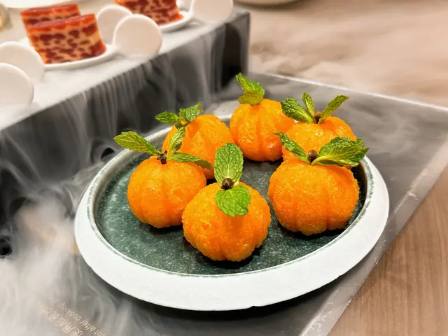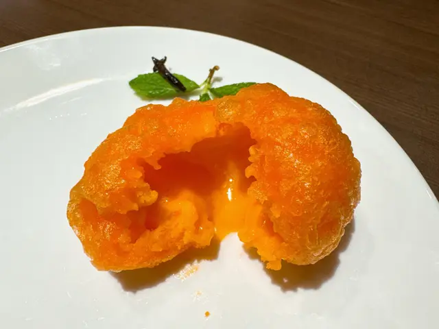 流心南瓜球,即叫即炸,外層口感煙靭,賣相可愛!上層加入薄荷葉及丁香,製作認真,內層流心嘅南瓜蛋黃醬,鹹鹹甜甜,為呢一餐畫上完美句號!