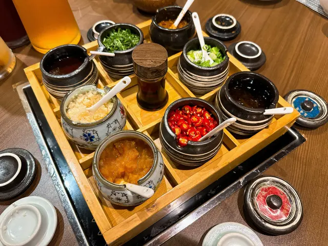 齊集各式各樣火鍋配料,如香蔥、芫荽、黃椒醬、沙嗲醬、蒜蓉、辣椒粒、乾蔥油及炸蒜,整齊地擺放於九宮格內,可以按自己嘅喜好調配心水醬料,好正!