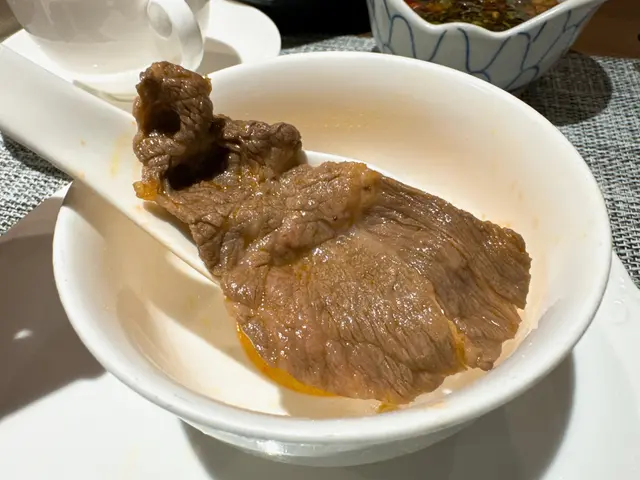 再黎一碟本地新鮮牛頸脊,色澤粉嫩紅潤,雪花紋理突出,重點係輕輕淥制後,肉質嫩滑得黎,帶點咬口,好出色!