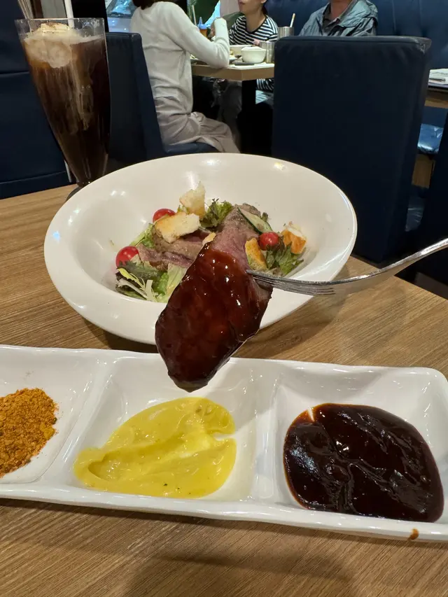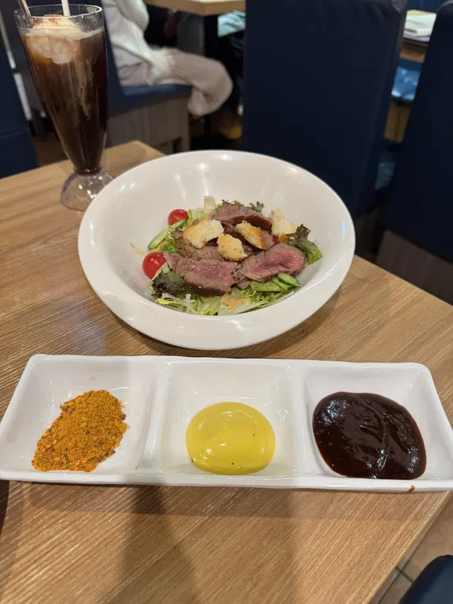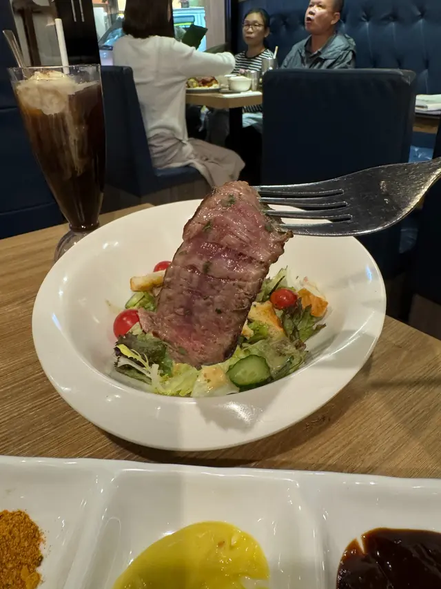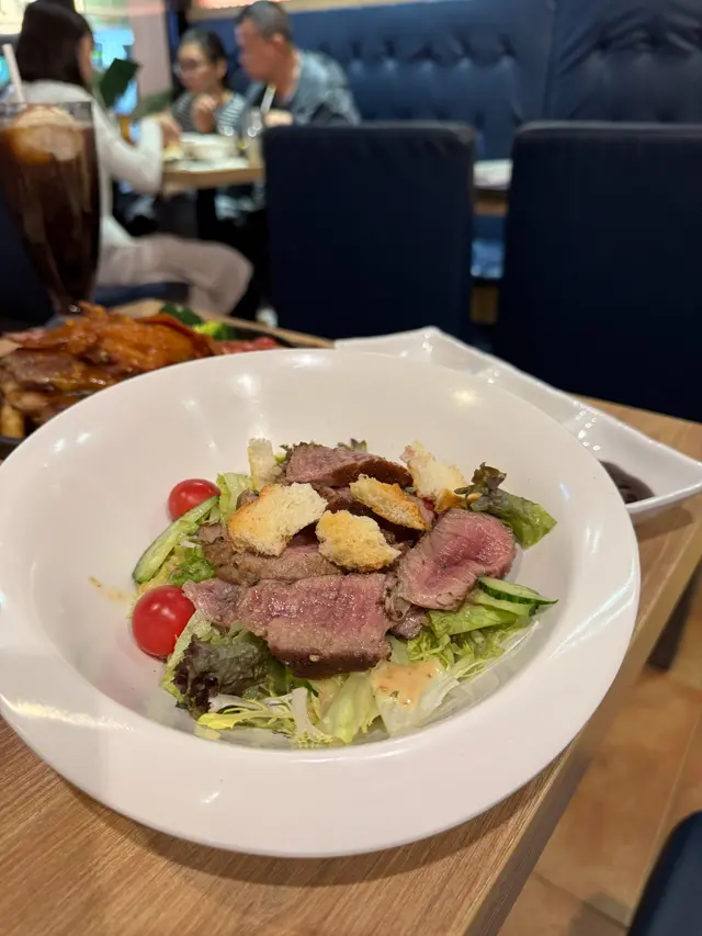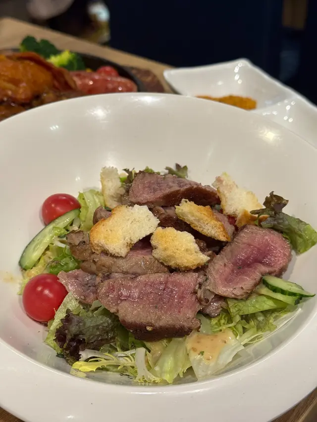 沙律健康最吸引,牛肉建議五至七成熟,外層微焦帶香,內裡依然嫩滑,配上蜜糖芥末汁或秘製BBQ 燒肉汁,香辣粉配鮮嫩燒牛肉,每口都充滿層次感。