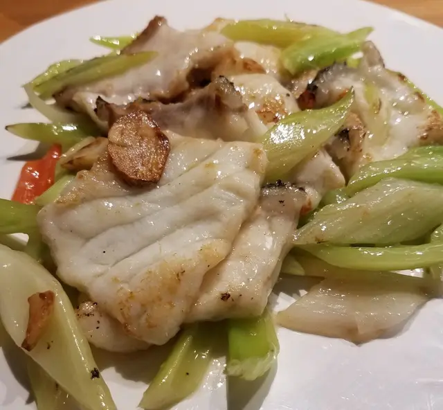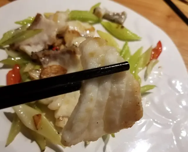 龍躉肉切片大小適中、只是太薄身,厚一點才配合炒球的標準。始終是人工大量養殖的沙巴龍躉,肉質結實得來較粗嚡,欠缺野生龍躉的結實中帶爽滑;魚味也不夠鮮,有一陣輕微泥腥味。只不過綜合價錢考慮,質素水平也可以接受。