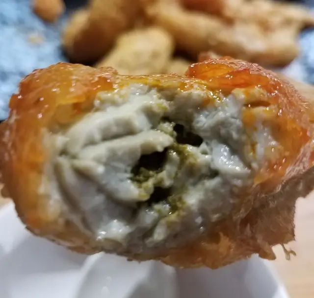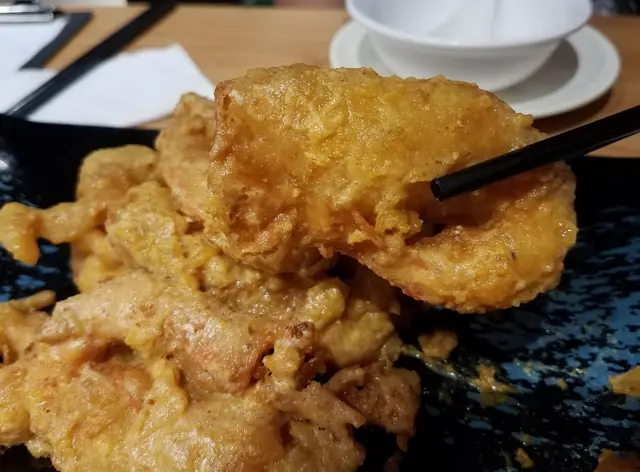 夾起一隻黃金蝦咬落去,覺得有啲唔妥。鹹蛋黃蓉醬汁煮得未夠徹底融化,部分鹹蛋黃仍然結成一塊塊,唔能夠完全做到「起沙」的效果,味道方面也稍嫌未夠鹹香。而且,原來整隻基圍蝦包了一層薄薄的脆漿,脆漿表面才是鹹蛋黃煮成的醬汁,唔怪得每隻基圍蝦好似大隻咗一個碼。