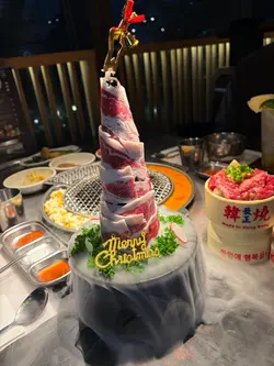 飄着乾冰嘅聖誕樹,好有儀式感,上面排滿牛胸腹。牛胸腹脂肪夠多,牛脂雪白,肉味濃。薄切快燒,肉汁鎖住好juicy。芝士薯仔煎餅唔係香脆果款,但好實在有質感,薯仔濕潤香口,芝士味香濃!