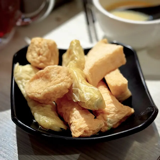 魚腐四拼$52!內裏包括有魚腐、魚片頭、墨魚春卷及鮮蝦卷,這些食材吸了雞湯後味道就更加吸引。